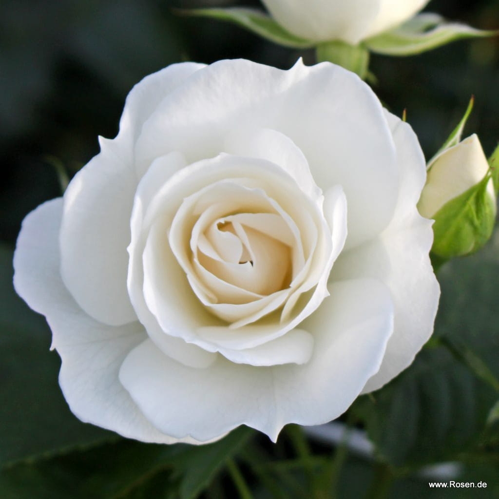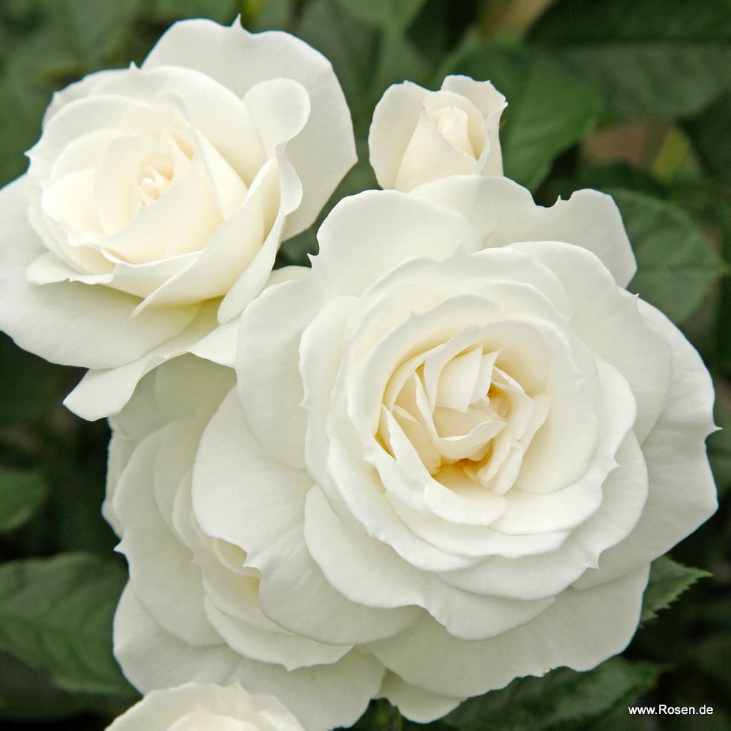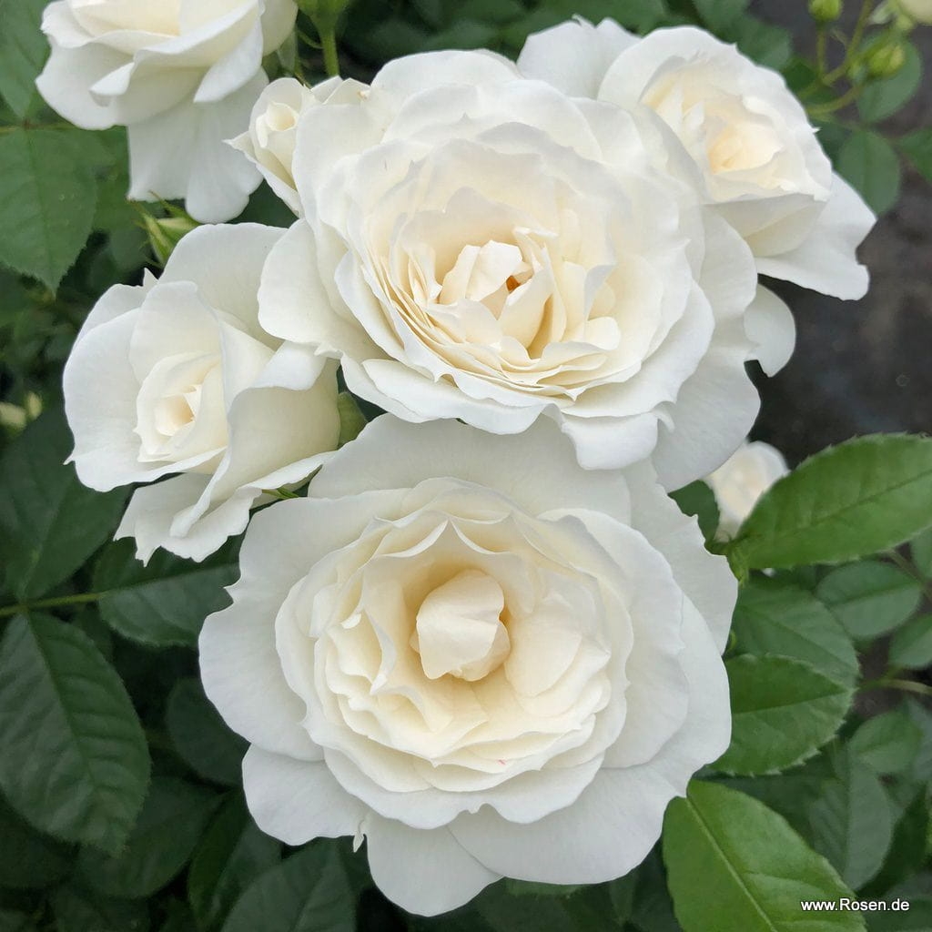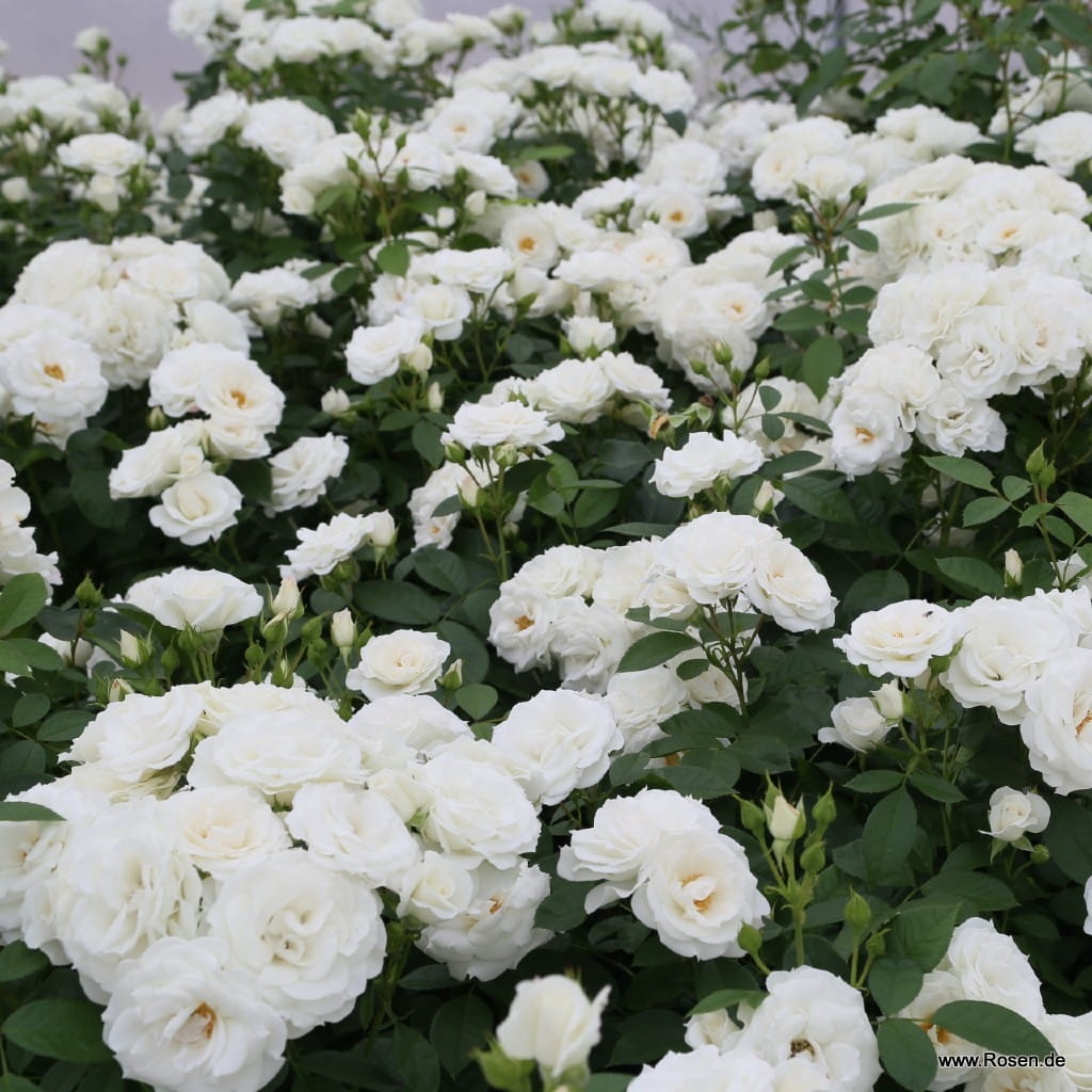 Kompaktowa róża rabatowa o białych półpełnych kwiatach na rabaty jak i do donic.