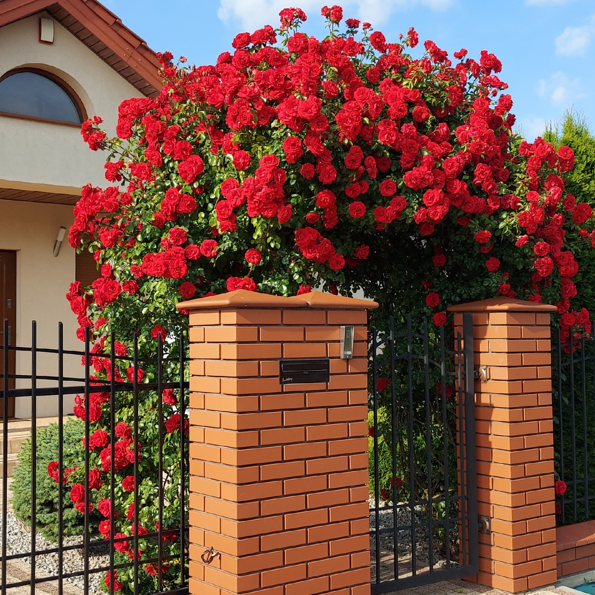 Piękna róża pnąca z grupy KLETTERMAXE®, o zdrowych, gęstych liściach i dużych, pełnych, błyszczących kwiatach.